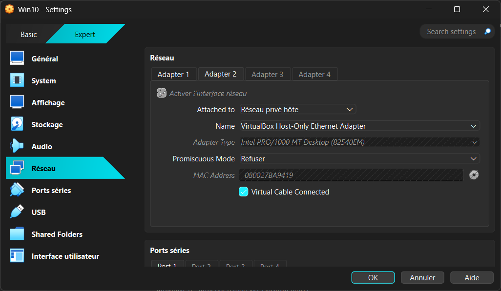 Cette solution va permettre de créer un réseau privé et isolé dans lequel il n'y aura que le PC hôte et les VMs. Pour garder la connexion à Internet on va garder l'interface réseau NAT, et on va ajouter une interface Host-Only puis démarrer la VM.