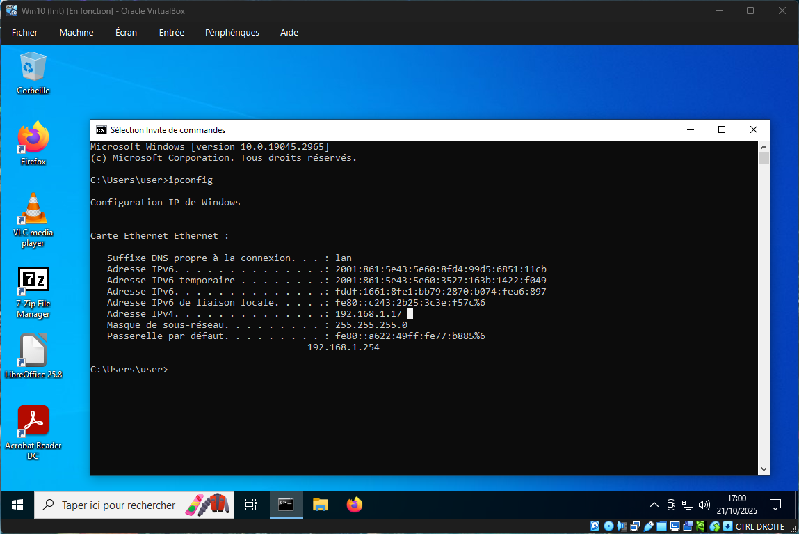 On récupère la nouvelle IP 192.168.1.17, on voit déjà qu'on est sur le même masque (/24) sur l'hôte.