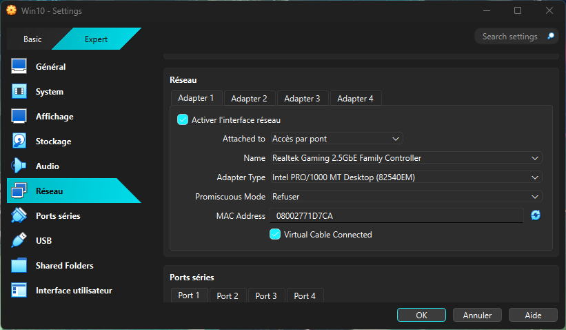 Sur la VM Win11, je suis passé directement en Accès par pont (Bridge). Aucun problème particulier.