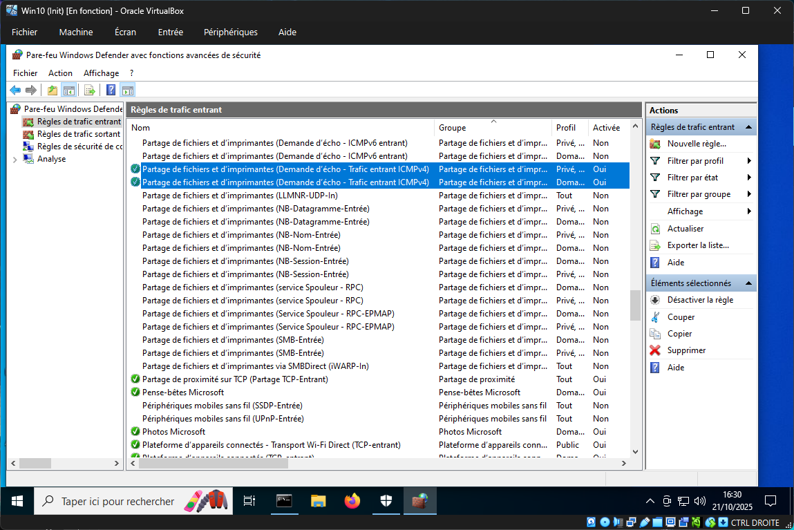Pour Ping l'hôte depuis la VM, je dois cette fois activer les règles de traffic entrant ICMPv4 sur l'hôte.