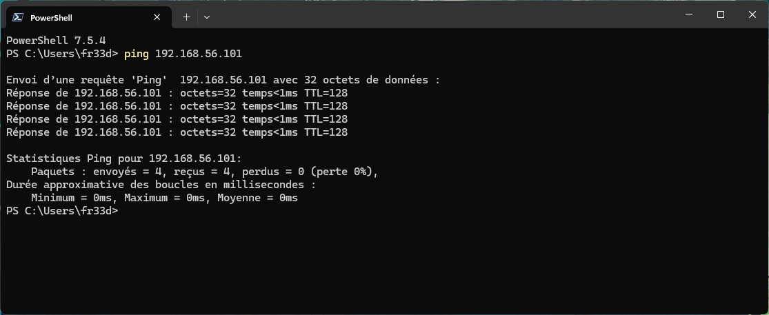 Une fois ces changement effectués, j'ai pu ping la VM depuis l'hôte et l'hôte depuis la VM.