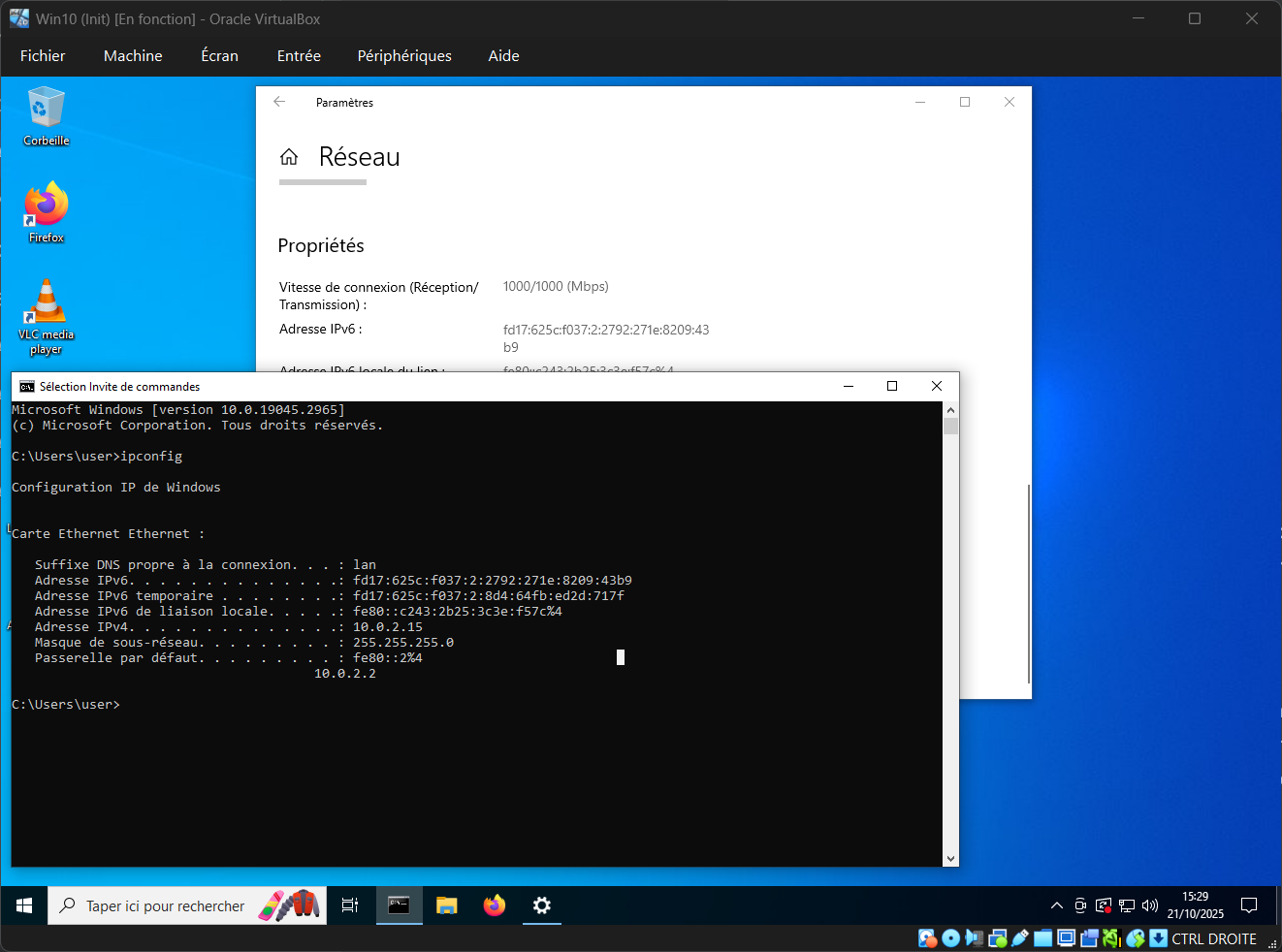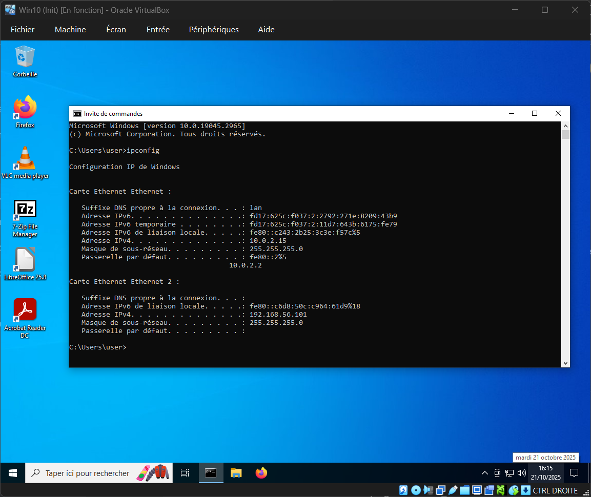 Pour ce test je vais chercher l'adresse IP de ma VM (ici la Win10), soit depuis le terminal en tapant ipconfig, soit dans les paramètres réseaux.