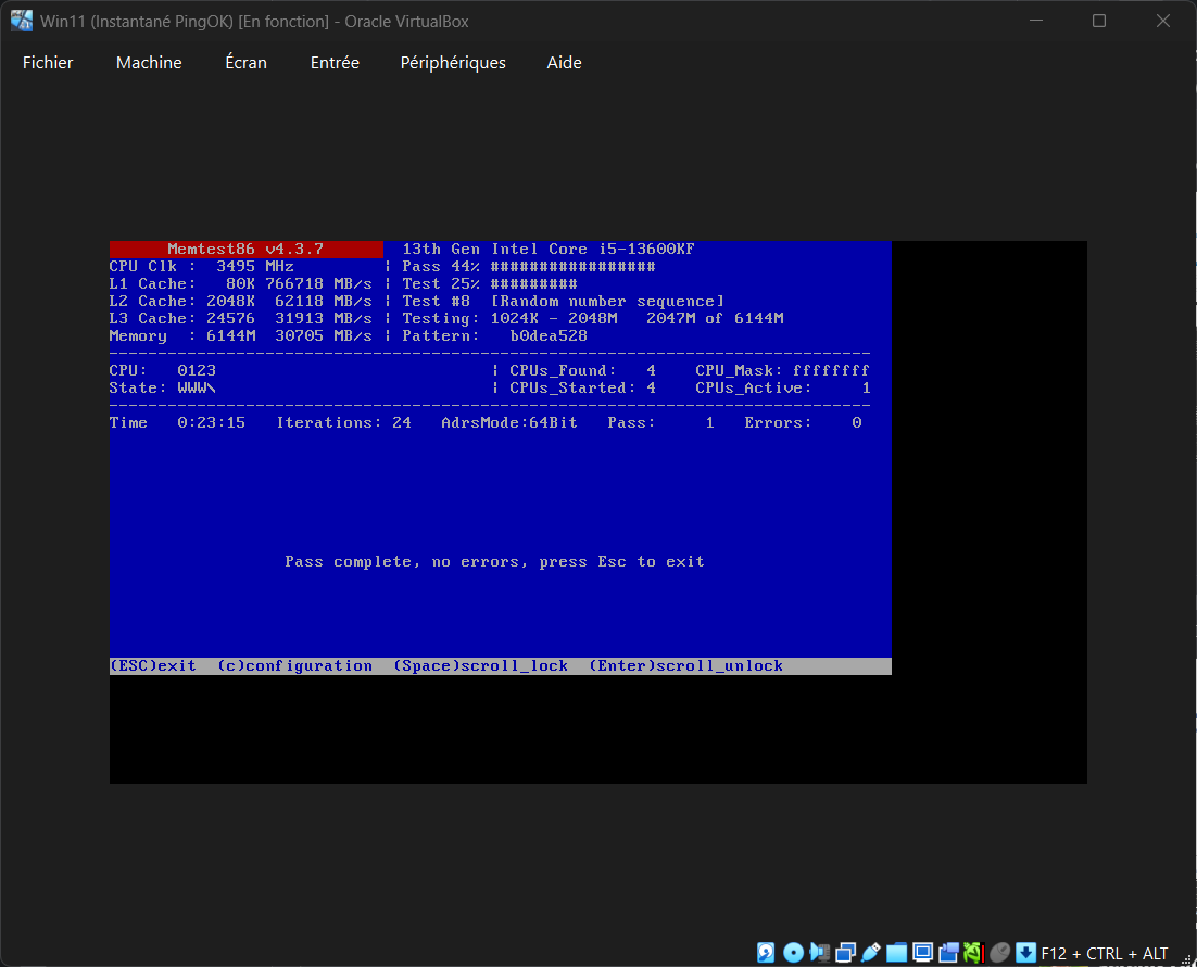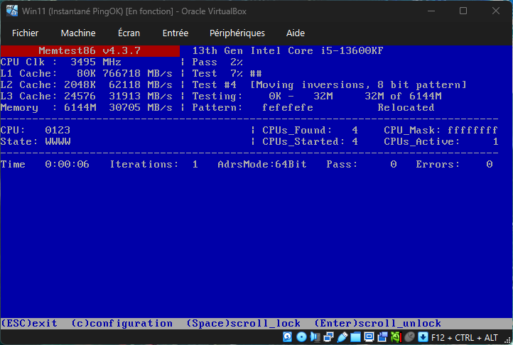 Lors du lancement de la VM on boot bien sur Memtest86 et on lance le test de mémoire.
