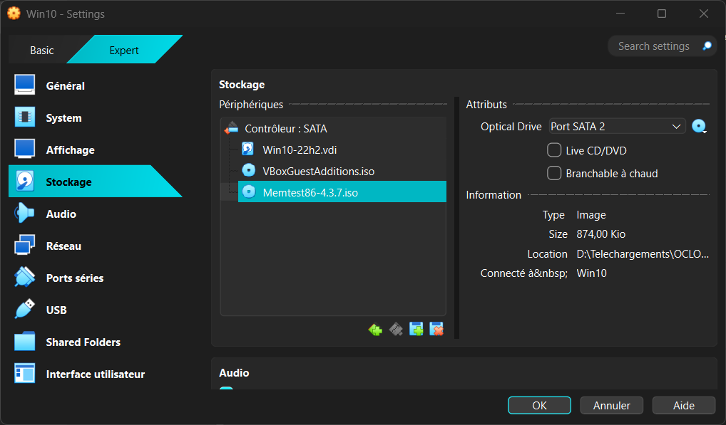 Pour le faire sur une VM, il faut télécharger le fichier ISO de l'exécutable, le mettre en tant que CD/DVD de boot, donc ajouter le fichier image dans les périphériques de stockage.