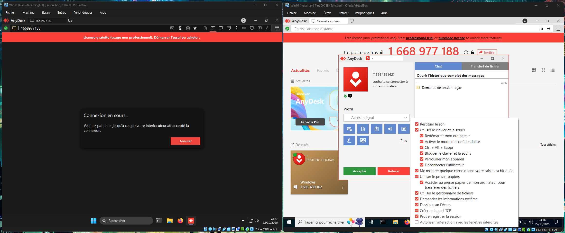 En me connectant de l'une à l'autre, la machine qui reçoit la demande doit accepter, il y a plusieurs choix avec des niveaux de sécurité différents, du simple partage d'écran, à la prise en main avec tous les droits.