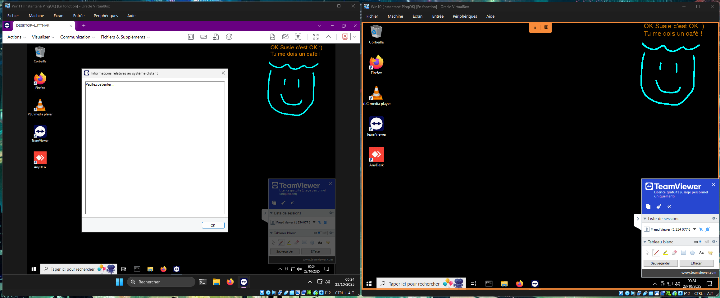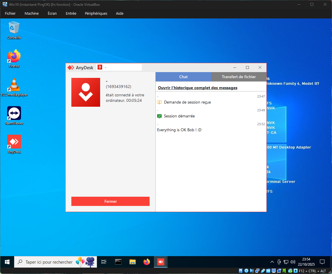 Une fois déconnecté, TEamviewer à fermé la session pour la machine cible qui n'a pas pu garder mon message, mais c'est peut être lié à la version gratuite.
