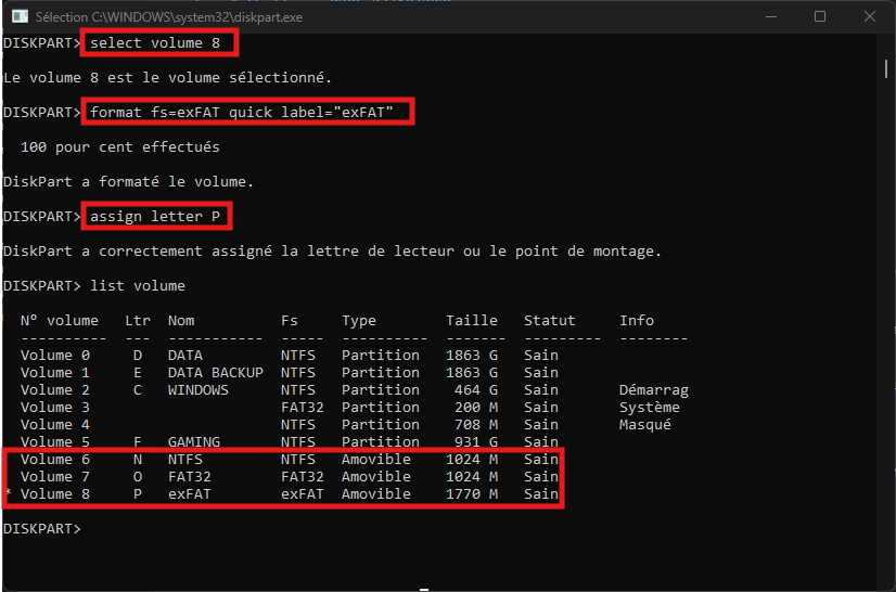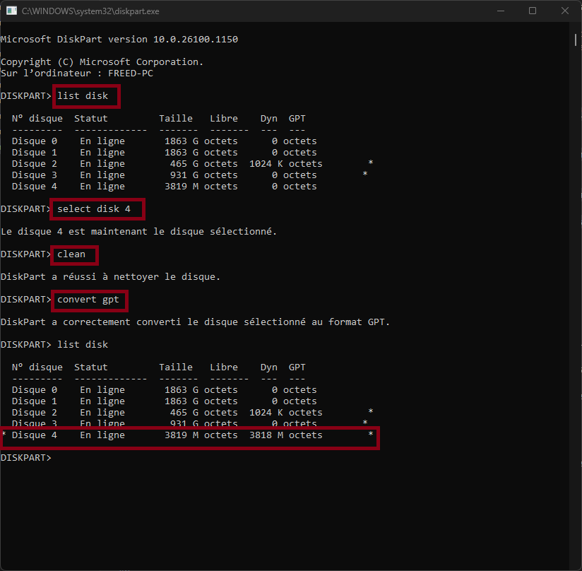Les commandes sont simples pour cette partie dans Diskpart : select, clean, format gpt.