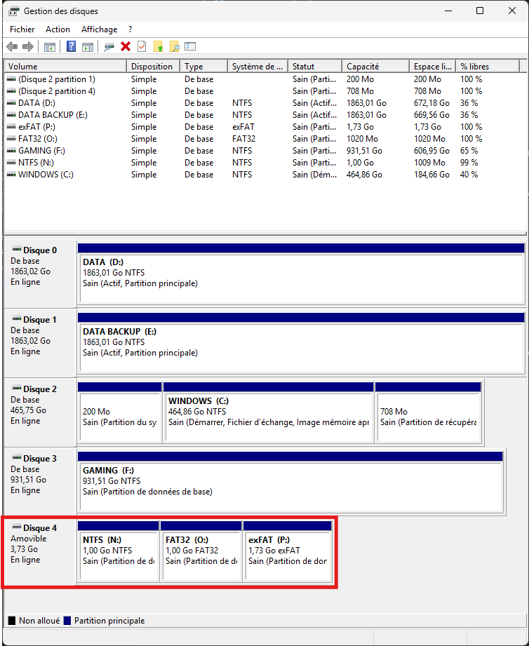 créer plusieurs partitions sur cette clé et tester de les formater avec différents systèmes de fichiers : NTFS, FAT32 et ExFAT