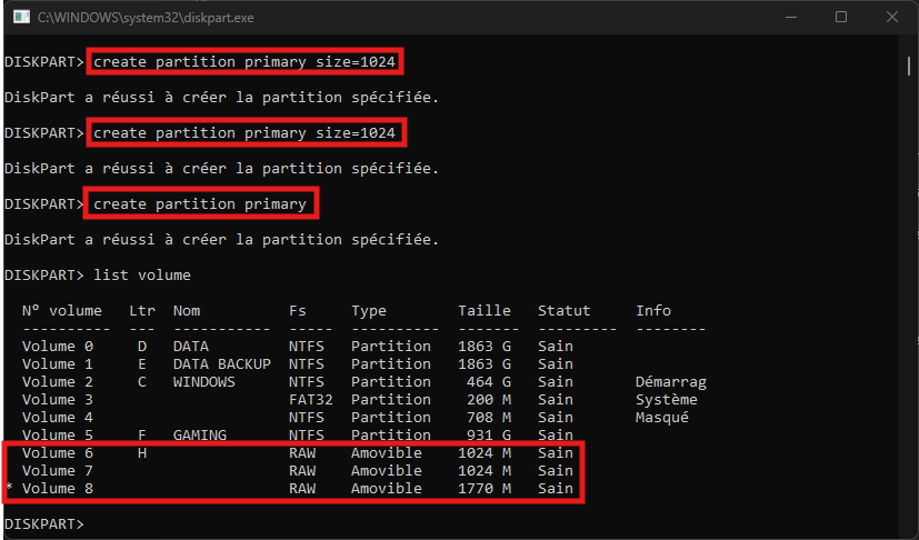 Sinon on pouvait aussi tout faire par l'interface Graphique du Gestionaire de Disques.
