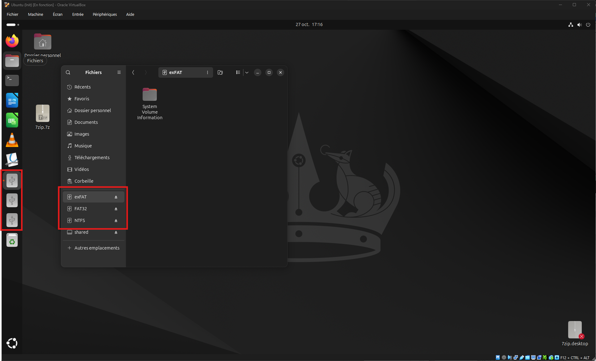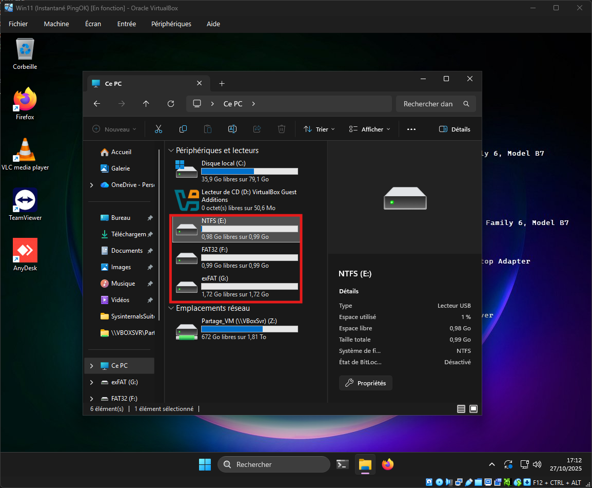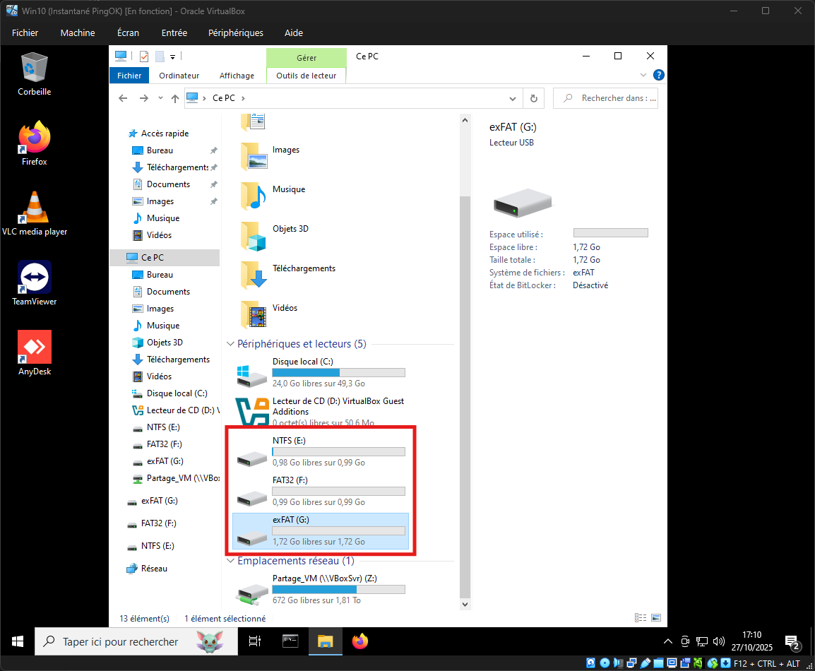 - Sur les VM Windows 10 et 11 et Ubuntu, les 3 partitions sont détectées et utilisables.