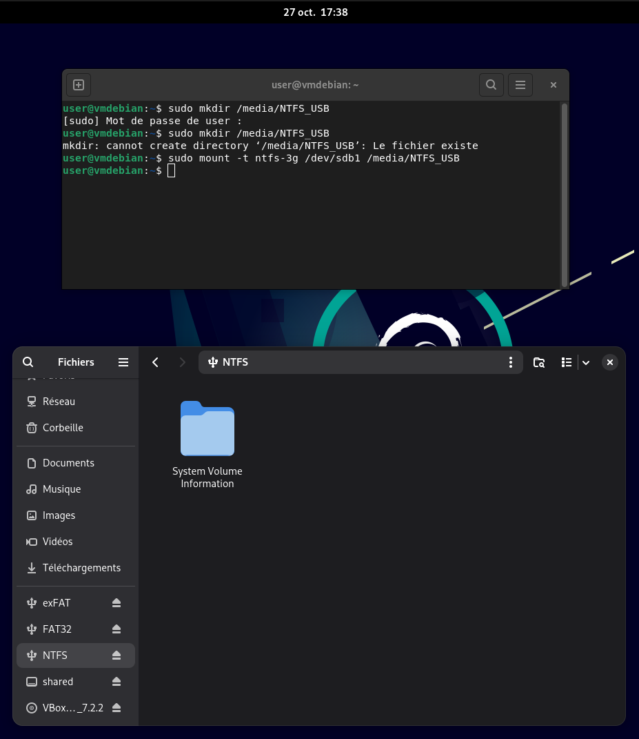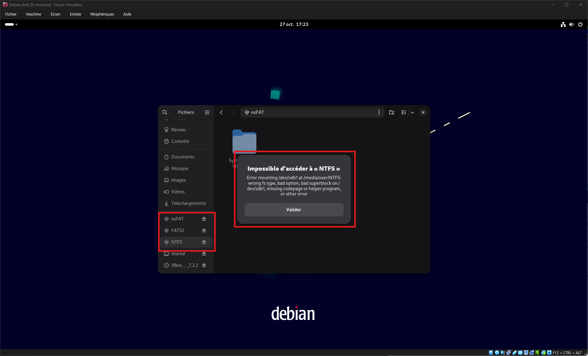- Sur la VM Debian il y a une erreur pour la partition NTFS,