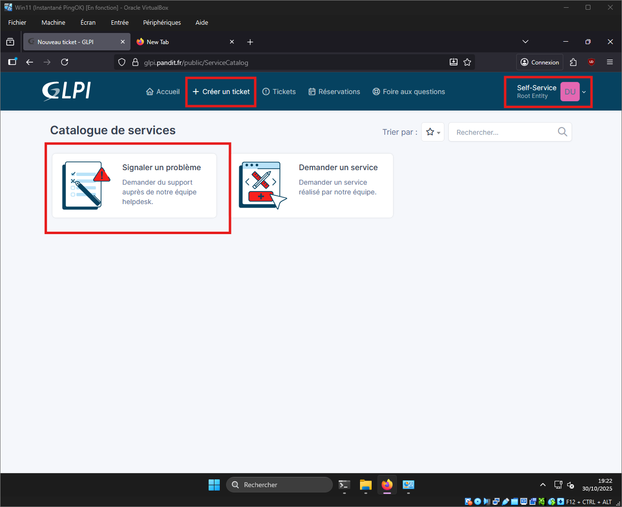 - Sur la VM je me log en tant qu'Utilisateur et je suis sur la page de service, je peux faire ma demande en créant un Ticket.