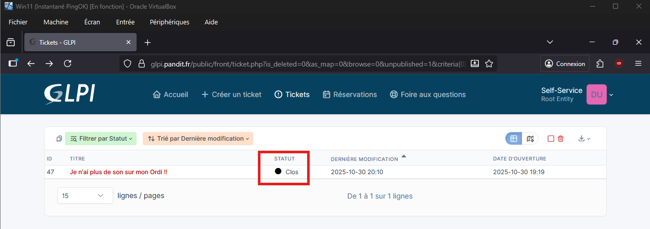 - Sur le serveur GLPI je retrouve bien ce ticket.