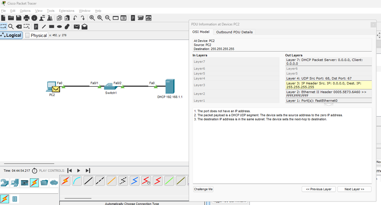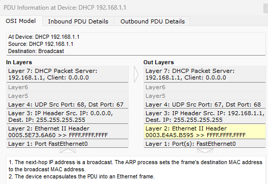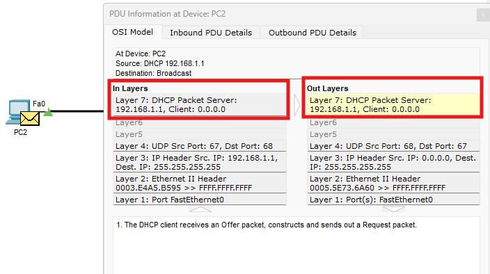 Quand il y a plusieurs Clients, je ne comprends pas comment le DHCP choisi le bon client pour renvoyer l'Offer ou le ACK vu que tout se fait en Broadcast, à moins que ce soit un bug de packet tracer.