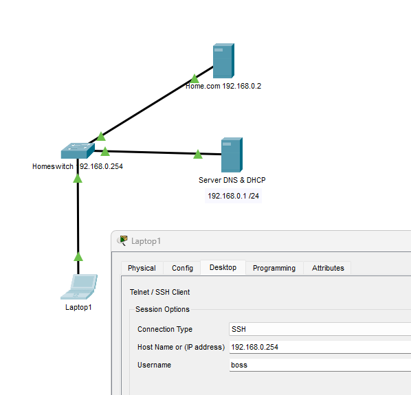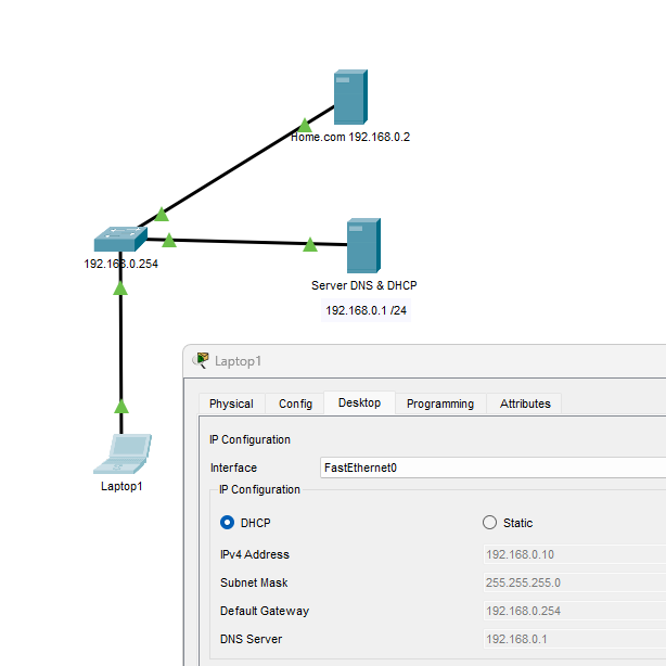 Je crée un réseau avec un Switch, un Serveur gérant DNS & DHCP, un Serveur hébergeant une page HTTP à afficher.