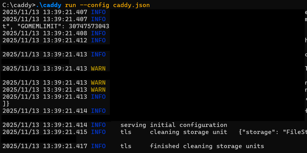 Lancement de Caddy via Terminal C:\caddy>.\caddy run --config caddy.json