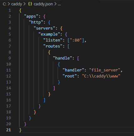 Installation de Caddy, la dernière release Windows adm64.zip, extraire dans le dossier C:/caddy, puis création d'un fichier .json de config dans ce même dossier et un dossier /www dans lequel on mettra les fichiers du site.