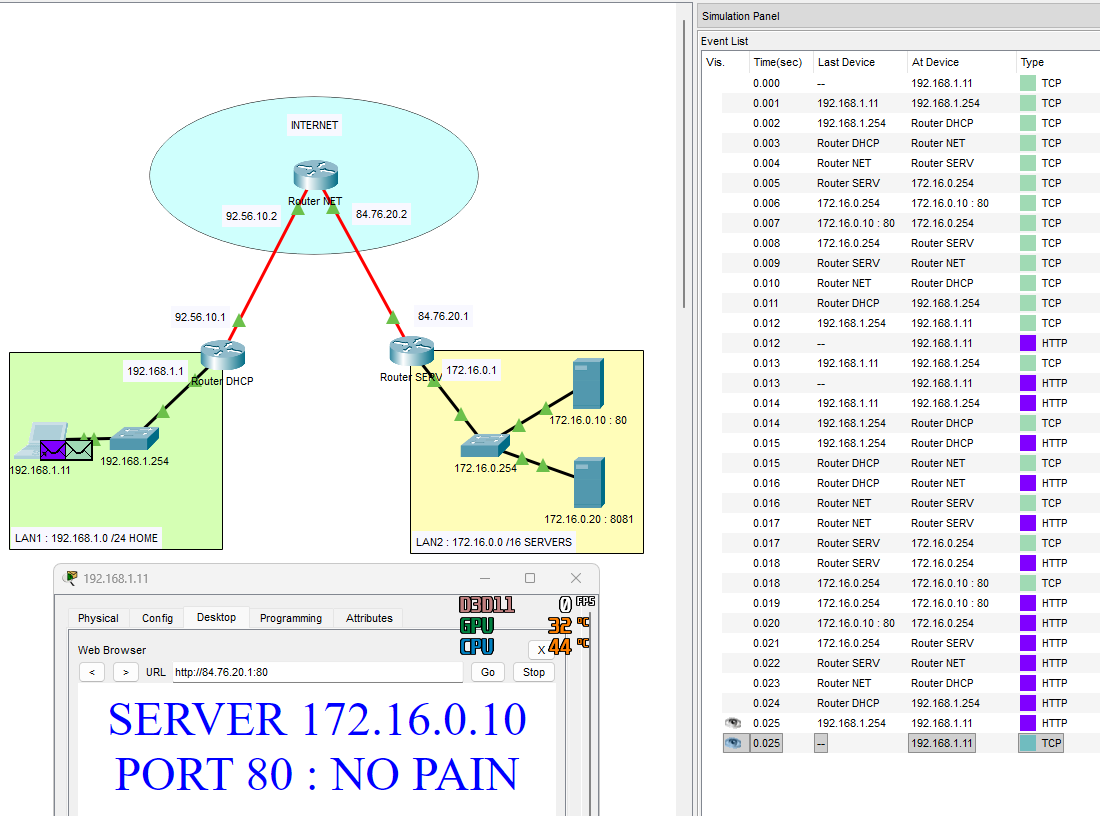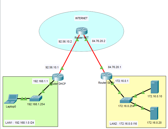 Je place et configure tout pour l'exercice. Config des IP fixes serveurs, switches, des gateway, des routeurs, des routes etc. Sur le Switch du LAN1 je configure un serveur DHCP pour mon Labtop. Je ping du Labtop aux serveurs : OK 🥳