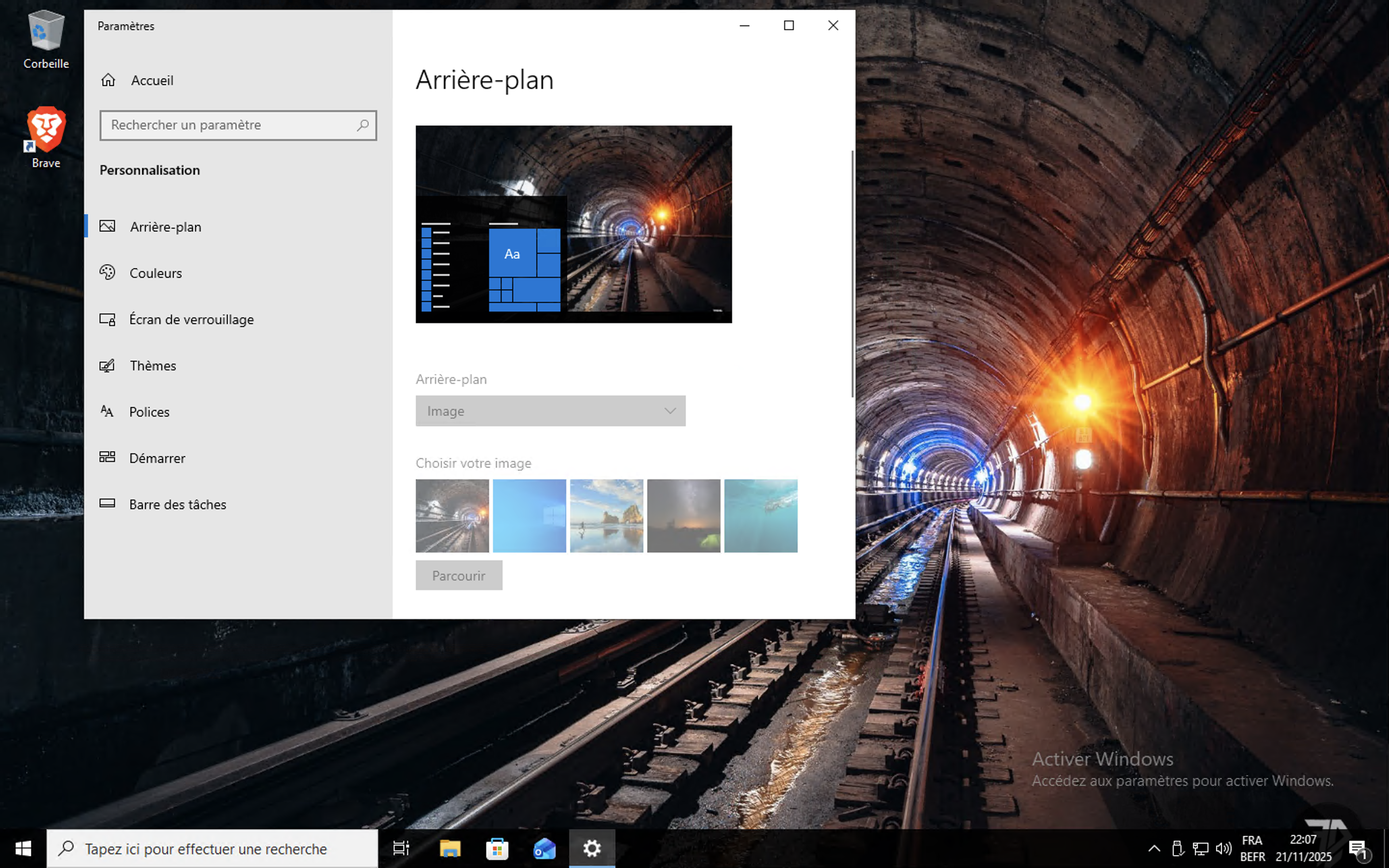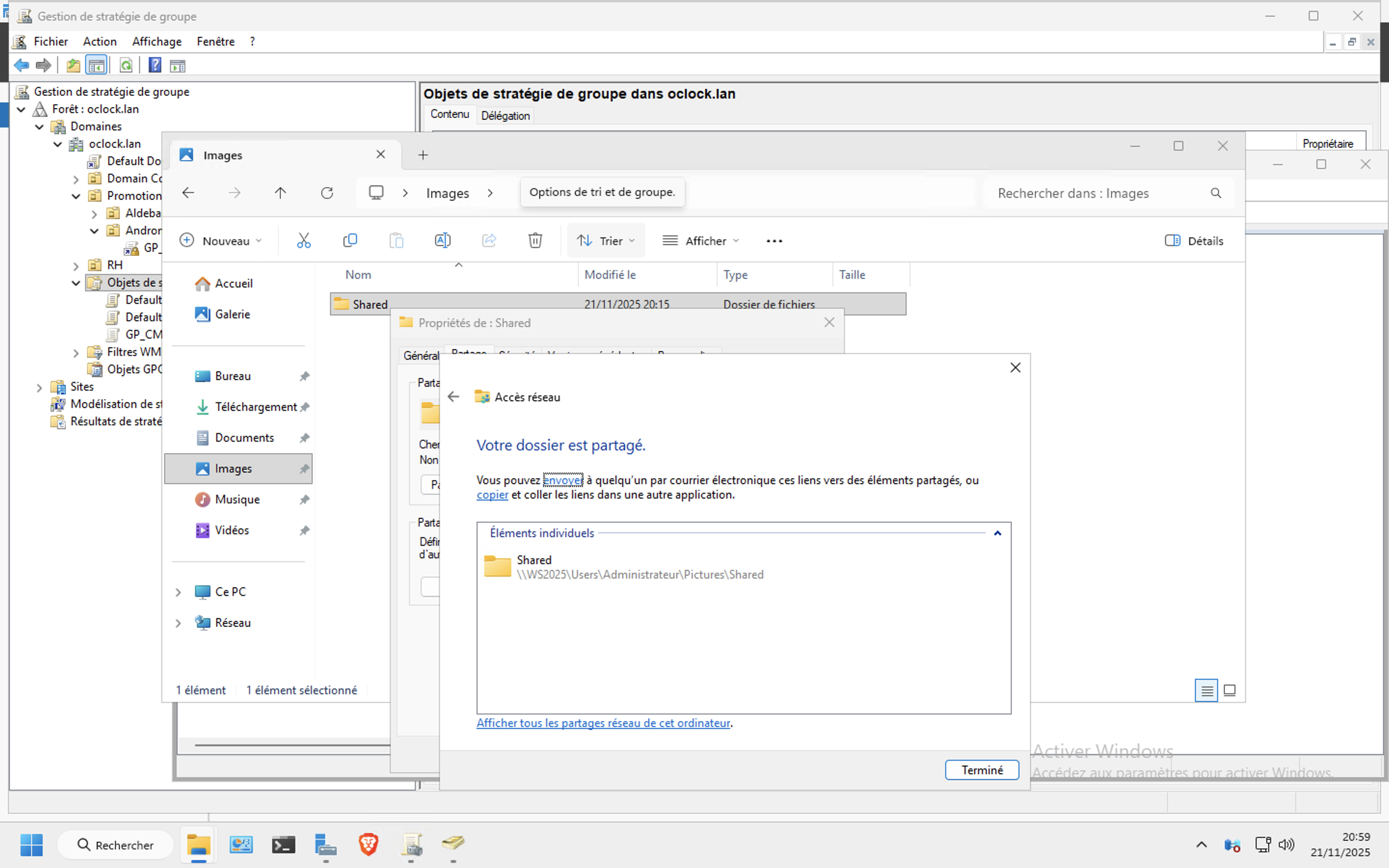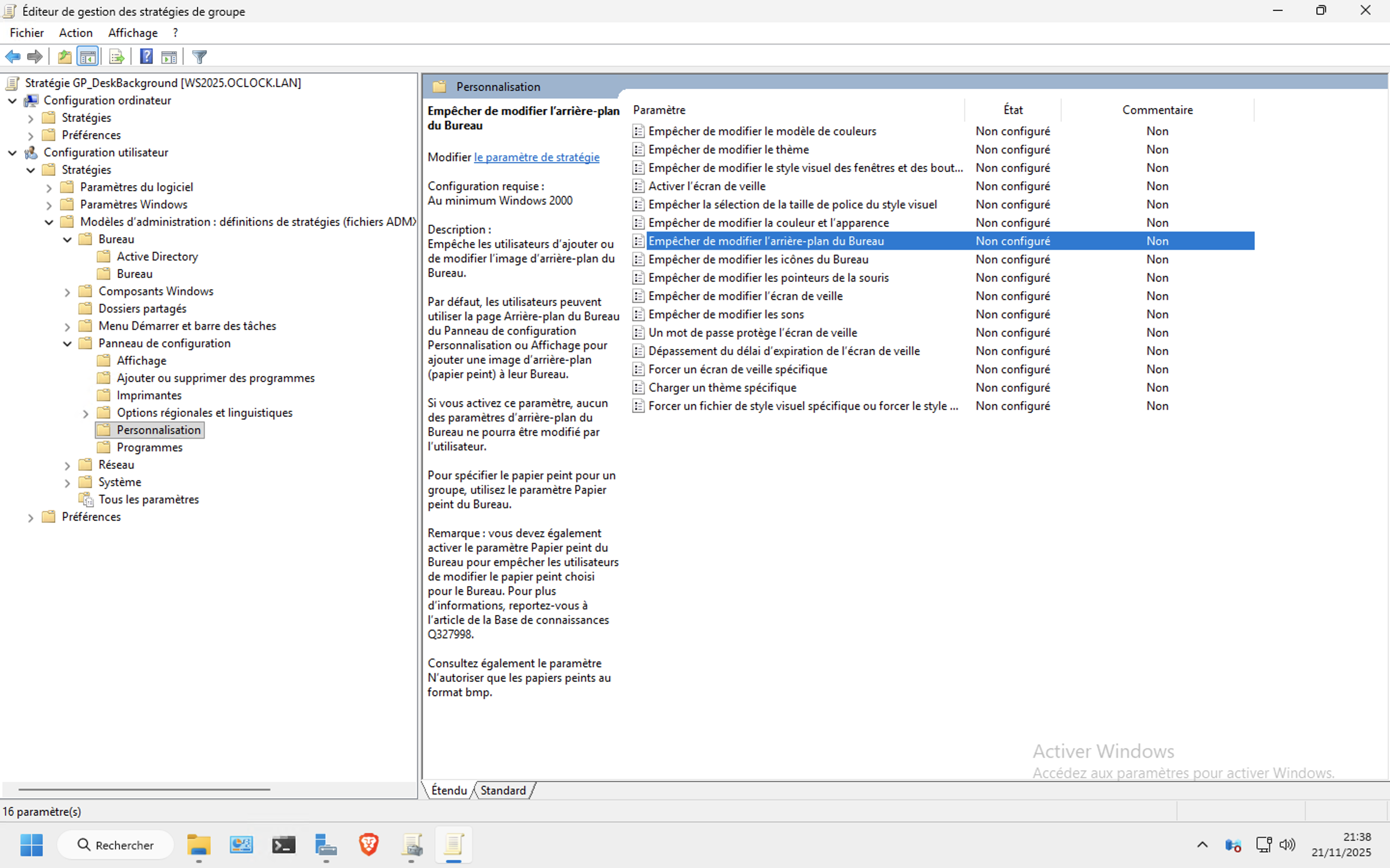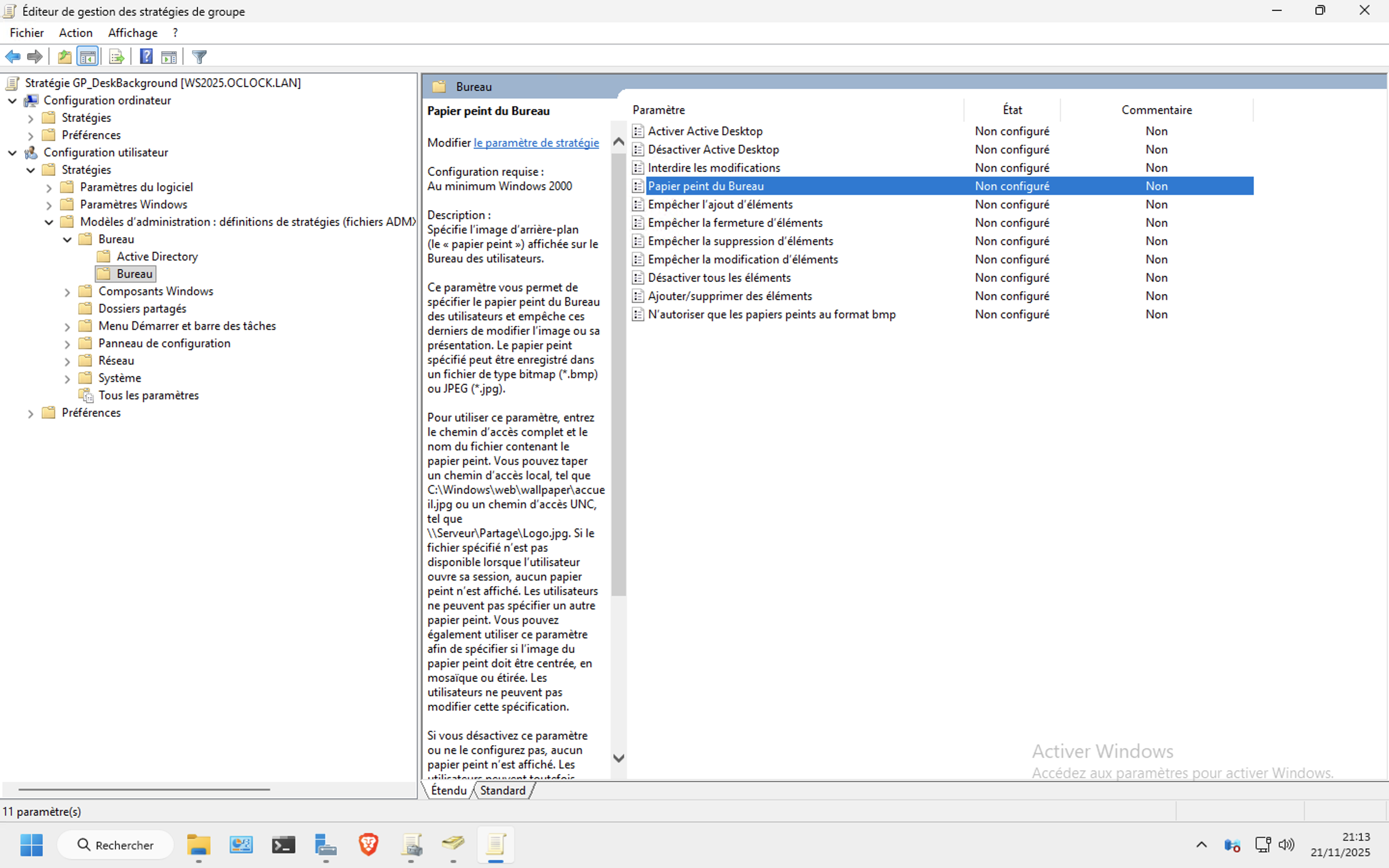 Pour mettre le fond d'écran on va activer le Modèle d'administration : Bureau : Bureau : Papier Peint Bureau et spécifier l'emplacement de celui ci (chemin réseau UNC : \WS2025\Users\Administrateur\Pictures\Shared\FreedexploreTunnel.jpg)