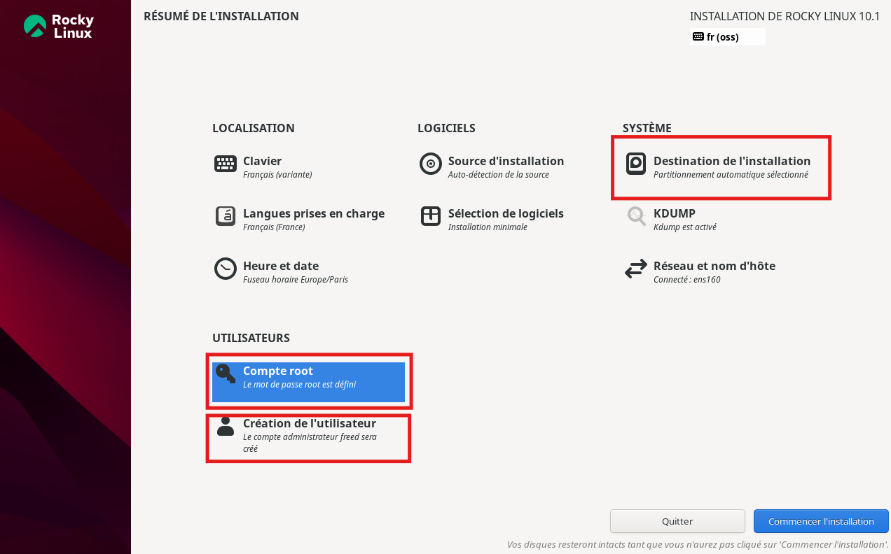 Rocky Linux est basé sur RHEL, assure la compatibilité matérielle optimale avec la version Red Hat Enterprise Linux 9 (64-bit). On va mettre la version minimale pour aller plus vite, et utiliser les lignes de commandes.
