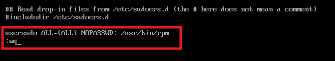 On va éditer le fichier de configuration sudoers à l'aide de la commande sudo visudo et de la gestion de VIM vu hier, il faut ajouter usersudo ALL=(ALL) NOPASSWD: /usr/bin/rpm et :wq pour write&quite.