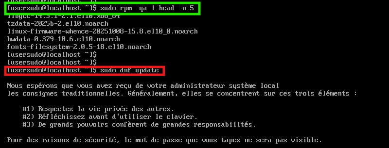 Test en passant sur mon usersudo su - usersudo, le rpm passe mais pas le dnf update, c'est bon.