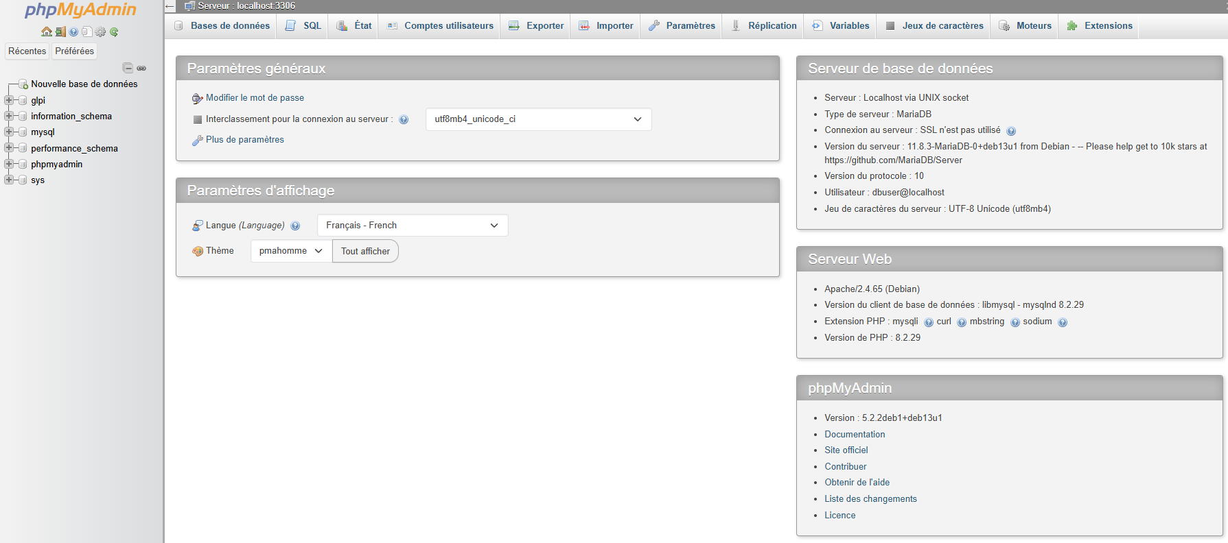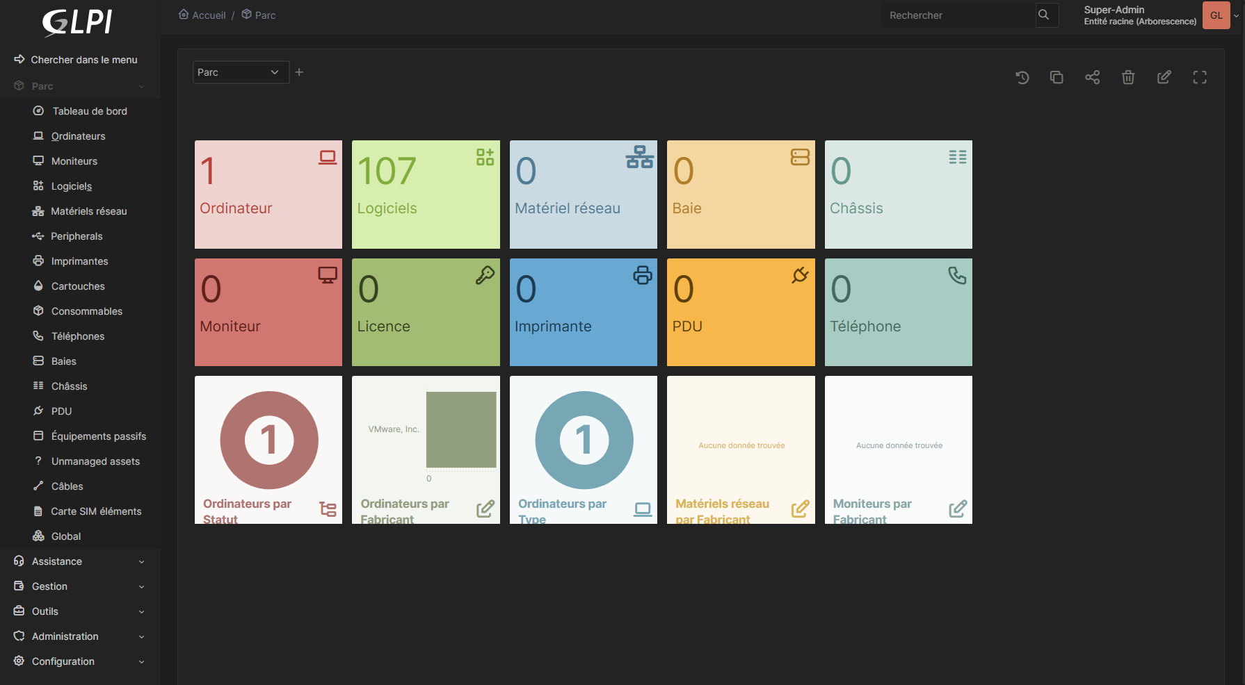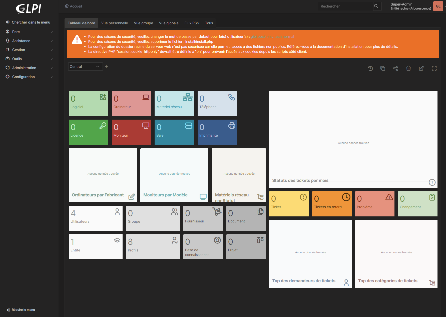 On a finit l'installation, et on peu se connecter avec glpi/glpi, et nous voilĂ sur notre tableau de bord !