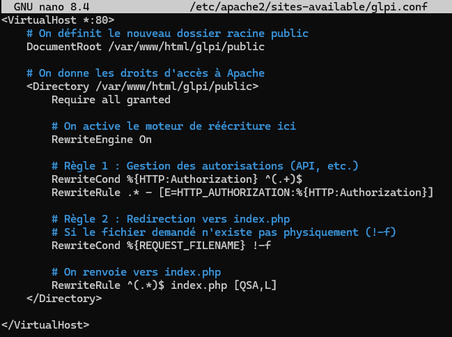 On va créer un fichier de configuration avec sudo nano /etc/apache2/sites-available/glpi.conf