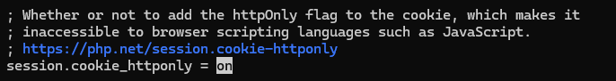 PHP directive "session.cookie_httponly" should be set to "on" to prevent client-side script to access cookie values.