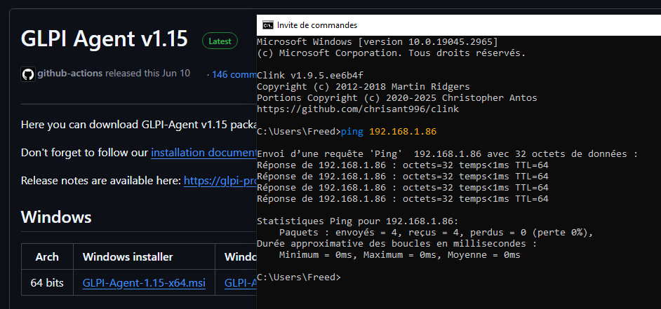 Depuis ma VM Windows 10 je ping mon serveur et je vais télécharger mon agent GLPI (.msi) sur https://github.com/glpi-project/glpi-agent/releases/tag/1.15