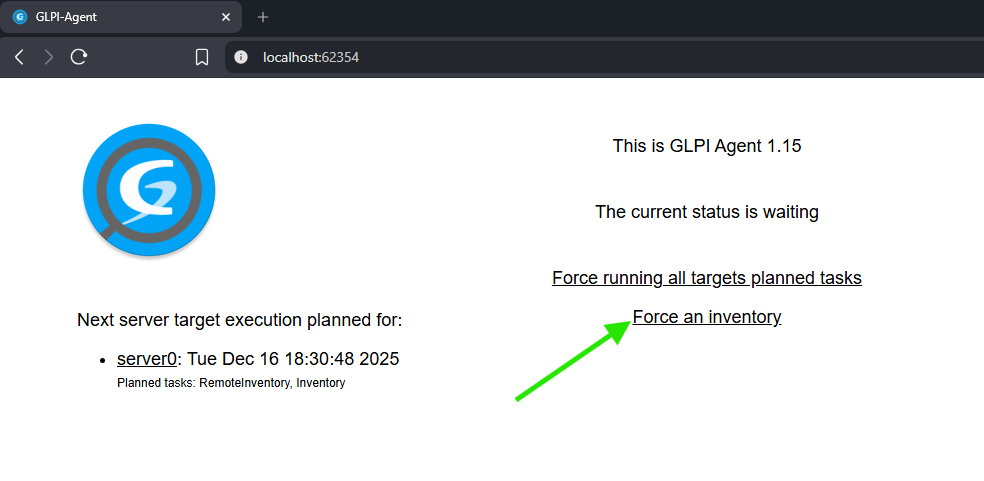 On va forcer l'inventaire en ouvrant http://localhost:62354 dans notre navigateur sur la VM Windows