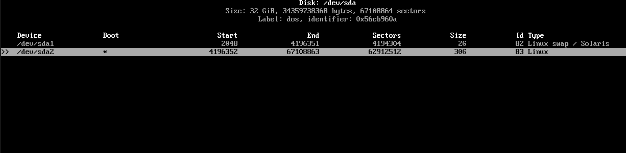 SWAP : 2G, Primary, Type 82 Linux swap / Solaris