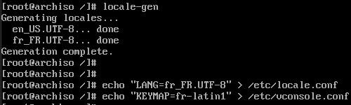 On génère les locales locale-gen et on définit la langue puis le clavier