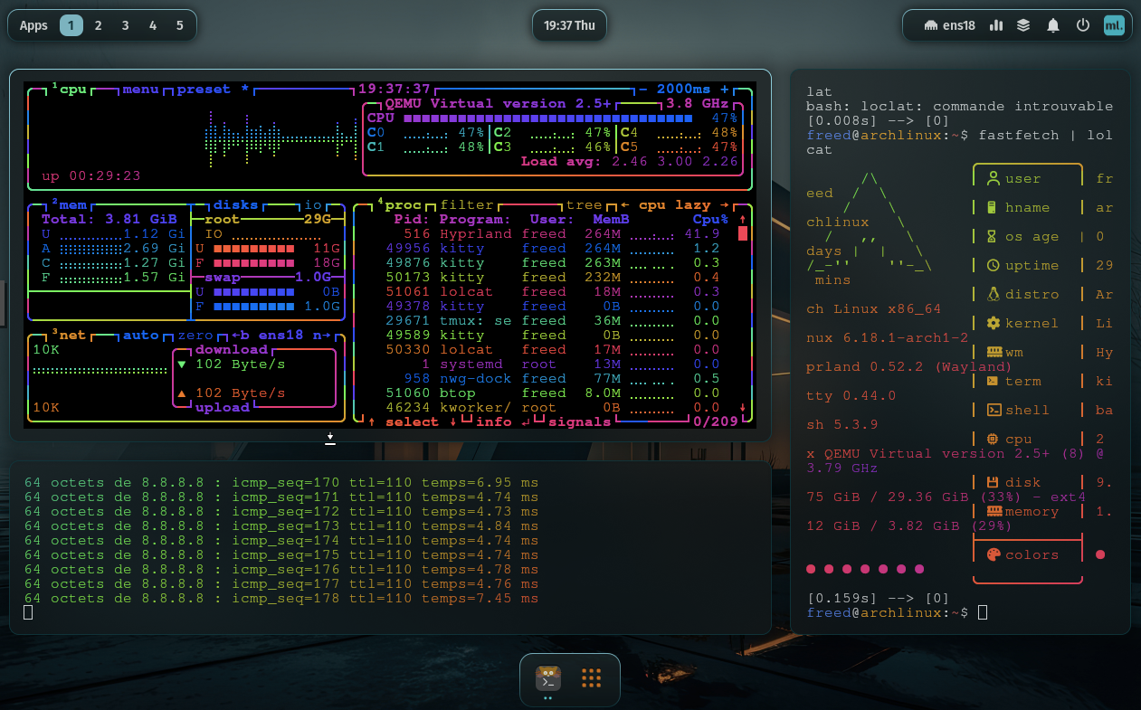 Sur Kitty (terminal), fastfetch donne le Logo arch avec les infos machine. Avec un | lolcat tout passe rainbow (aïe)