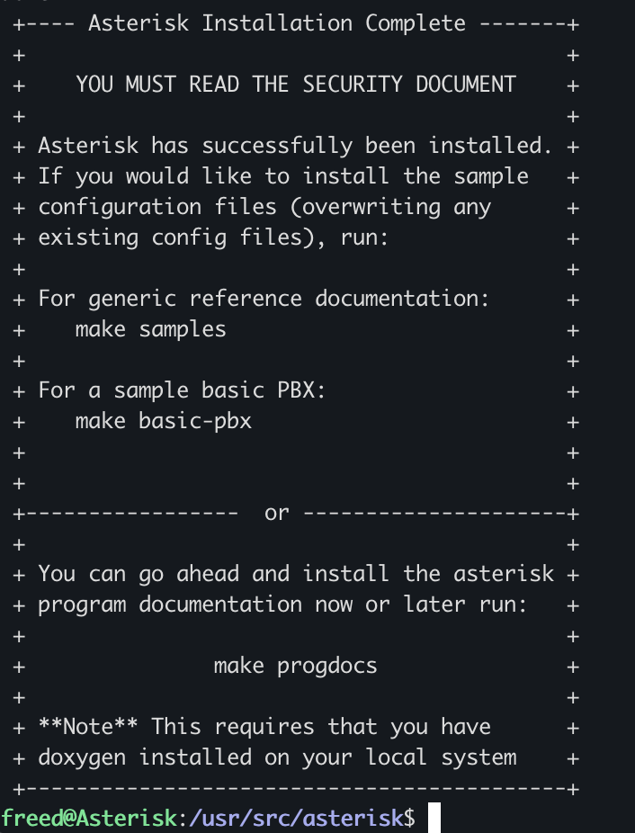 On complète l'installation en ajoutant la documentation relative à Asterisk ainsi que les fichiers de configuration par défaut. sudo make samples