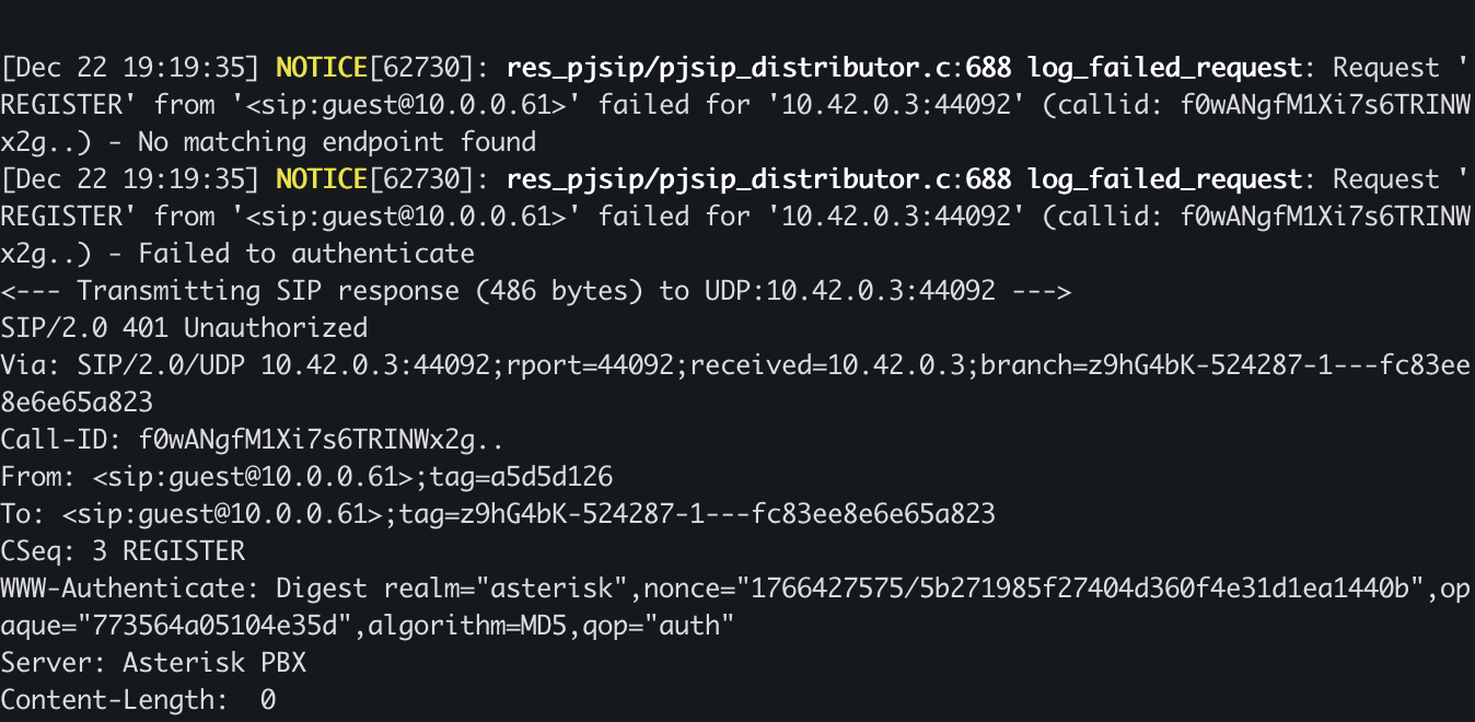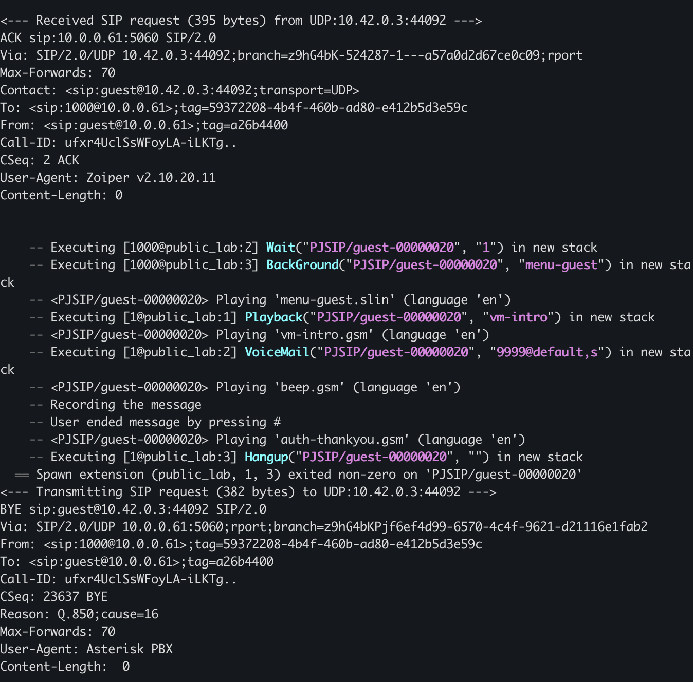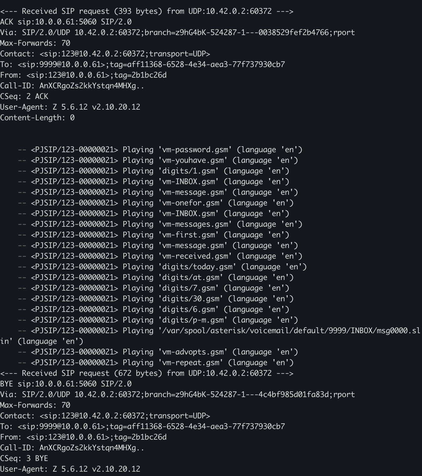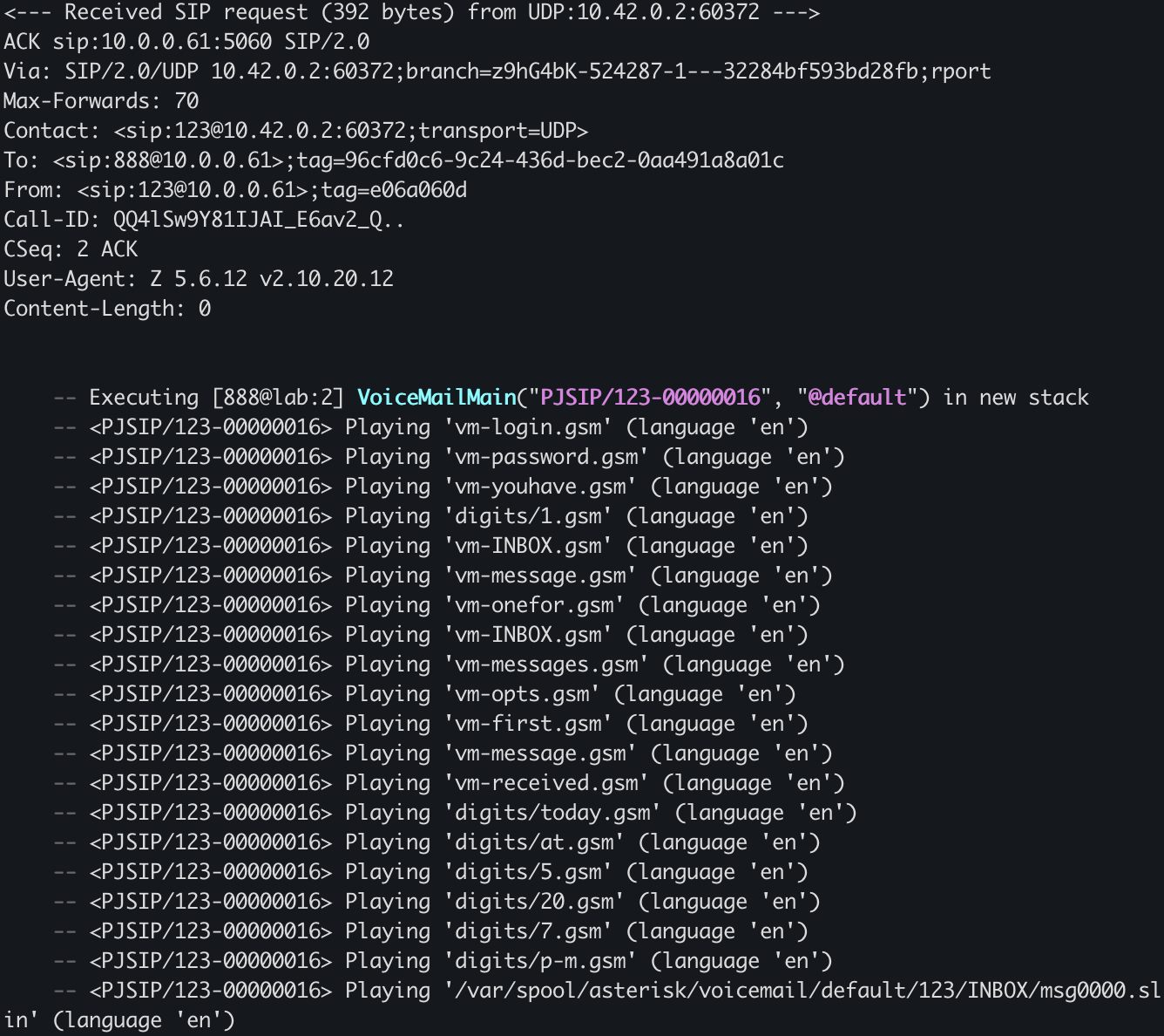 Je peux écouter le message laissé en appelant le 9999 depuis la machine qui n'est pas Guest (pswwd 0000), logs :