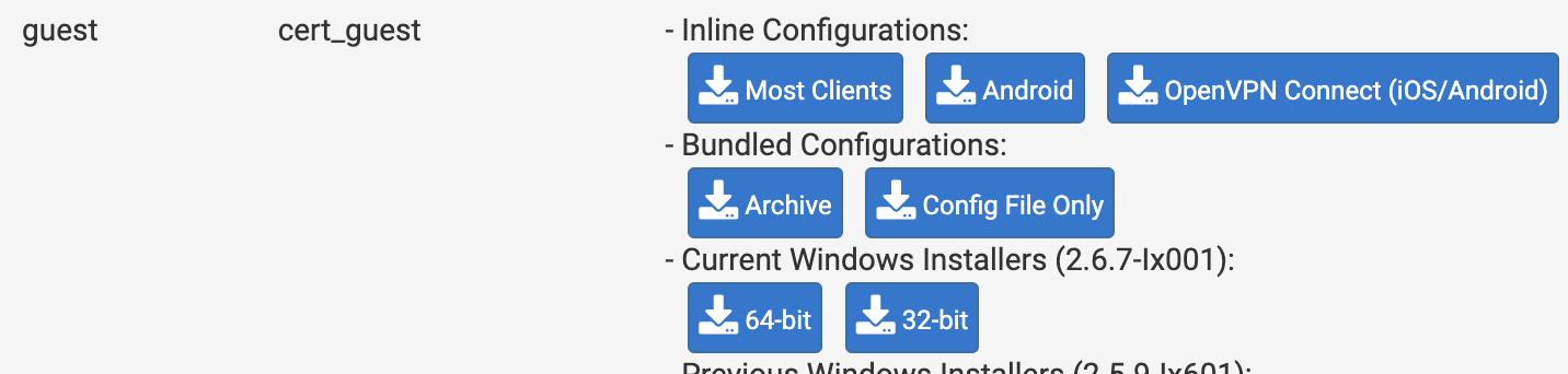 On va récupérer le fichier de config dans VPN > OpenVPN > Client Export > Guest > Inline config > Most clients