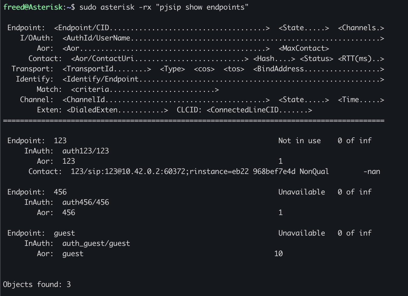 On tente un reload pjsip puis avec sudo asterisk -rx "pjsip show endpoints" on vérifie nos endpoints