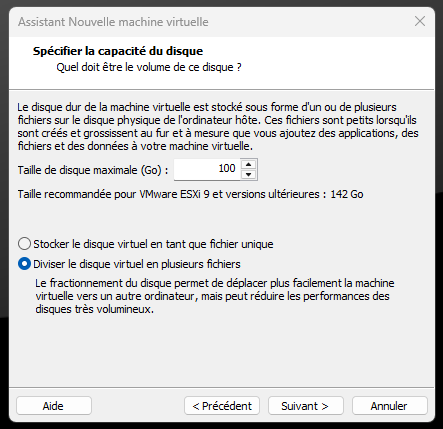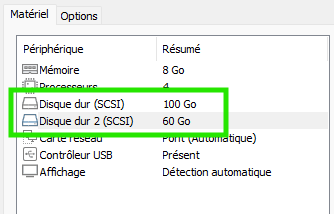 Disque, on peut réduire à 100 Go, cela devrait être suffisant : 33 Go pour le système, 67 Go pour les VM