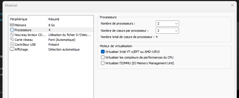 Paramètres matériel : 2 vCPU, 4 à 8 Go de RAM, et surtout la virtualisation Intel VT-x/AMD-V, et l'image d'installation