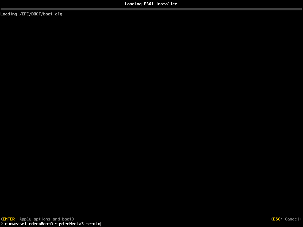 En suivant cette méthode, on peut utiliser une commande de démarrage (Boot Option) pour forcer ESXi avec l'option systemMediaSize=min (Small). Cela force la partition système à faire 33 Go maximum, libérant tout le reste pour les VMs.