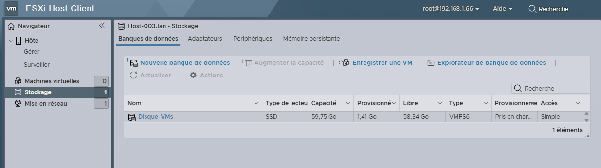 Apparemment l'option n'a pas fonctionné, on a pas de disque de stockage disponible dans Stockage / Banque de données / Nouvelle banque de données > Pas de périphérique disponible.