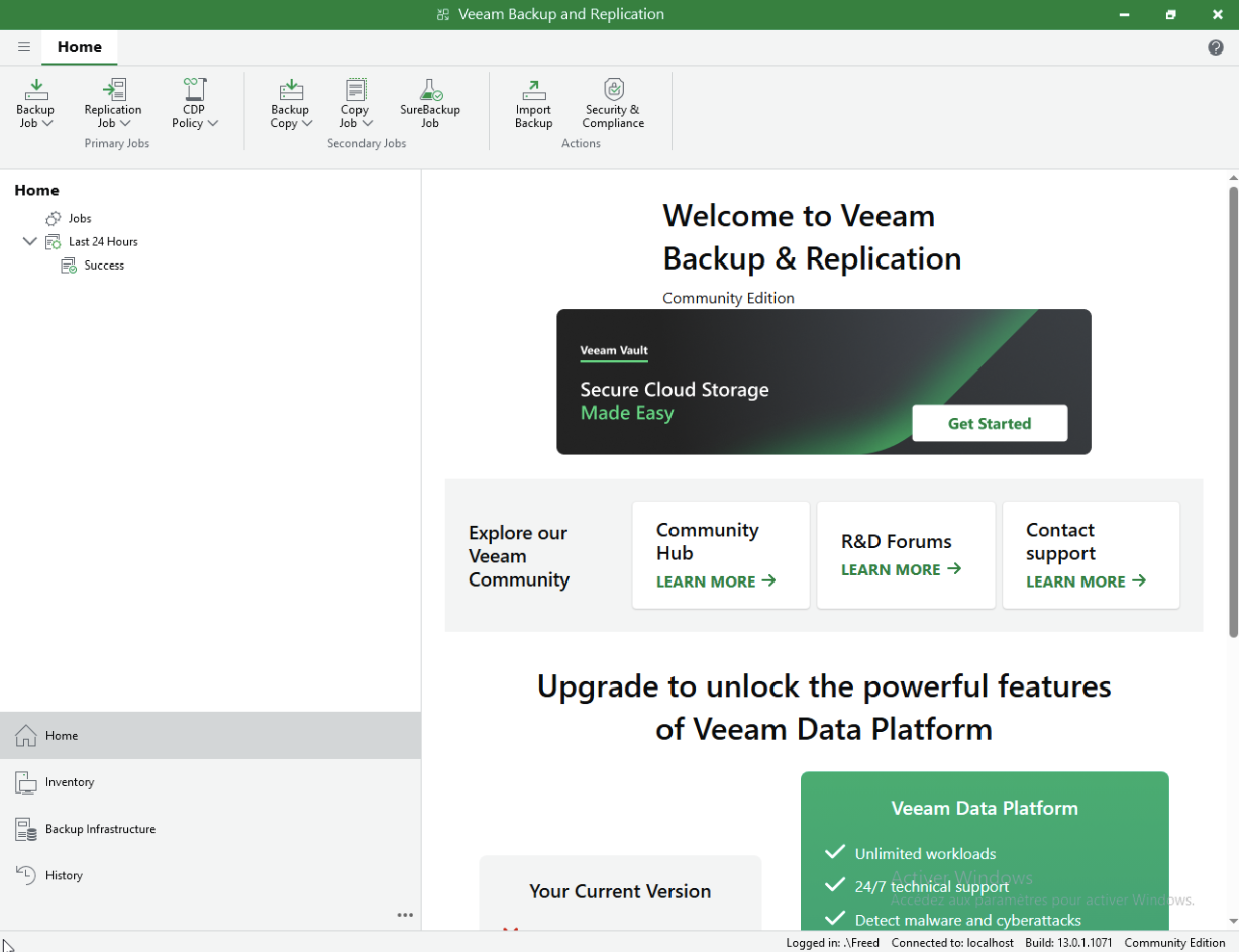 On redémarre et maintenant on peut se connecter à notre console Veeam en local