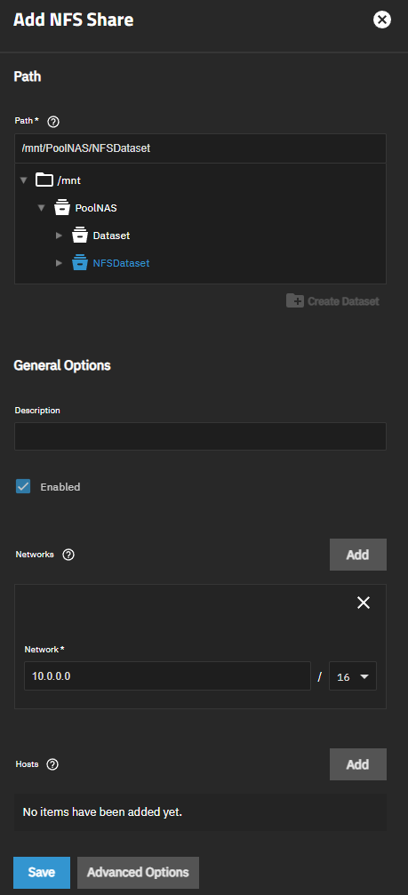 On va faire de mĂŞme pour le NFS, attention ici on est sur une structure serveur (format Linux, sensible aux majuscules, qu'on peut retrouver dans TrueNAS)