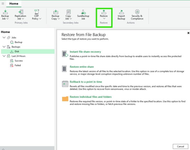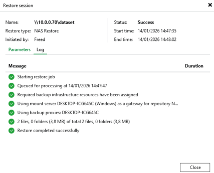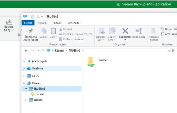 On va vider les fichiers dans le Dataset SMB, on va sur Veeam, Home : Restore : File Share