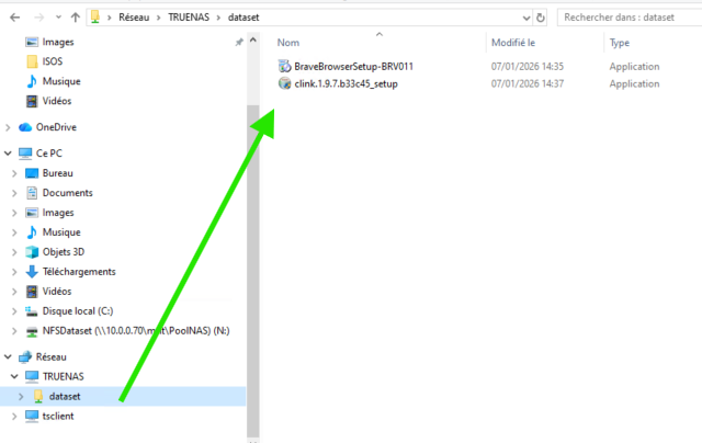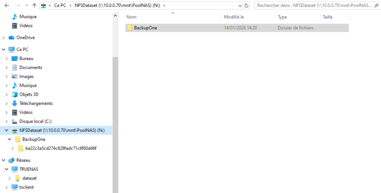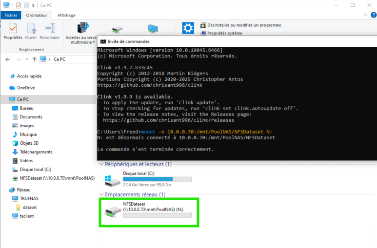 Dans un invite de commande on lance mount -o 10.0.0.70:/mnt/PoolNAS/NFSDataset N: