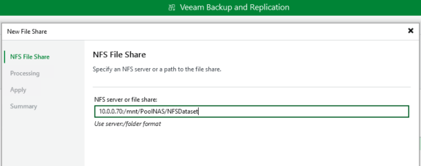 "Hé Veeam, je te présente le dossier NFS qui se trouve sur l'IP 10.0.0.70. Désormais, considère-le comme un 'Repository' utilisable pour mes jobs de Backup."