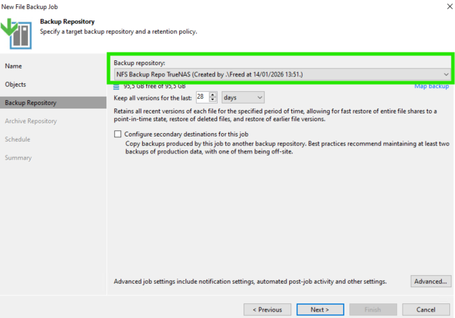 Puis on sélectionne notre Repo NFS créé précédemment, on configure le nombre de versions de backup à garder et on peut même choisir un second endroit de Backup (par exemple pour notre règle 3-2-1). Dans Advanced on peut configurer plus précisément, avec les permissions, la compression, le chiffrement, lancer des scripts, des notifications etc