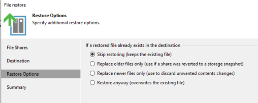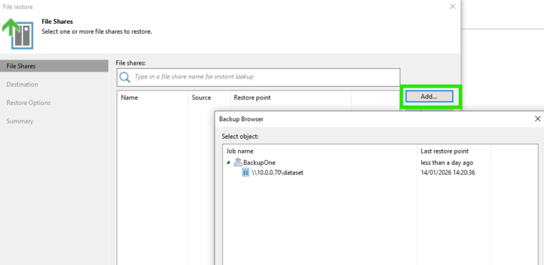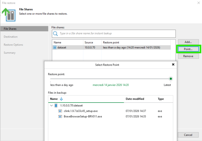 On va choisir un Restore Entire Share, et ajouter le restore point de notre Backup (on voit les horaires précis de ces sauvegardes)