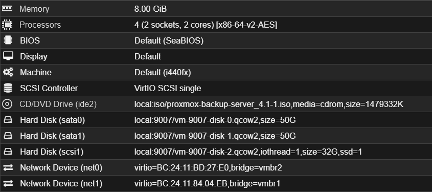 Lors de l'installation, on ajoute 2 disques en SATA pour les datas, on fait l'installation sur le disque SCSI, on ajoutera avant de démarrer une second vmbr (vmbr1) pour être sur le réseau interne entre nos VM et notre serveur Proxmox